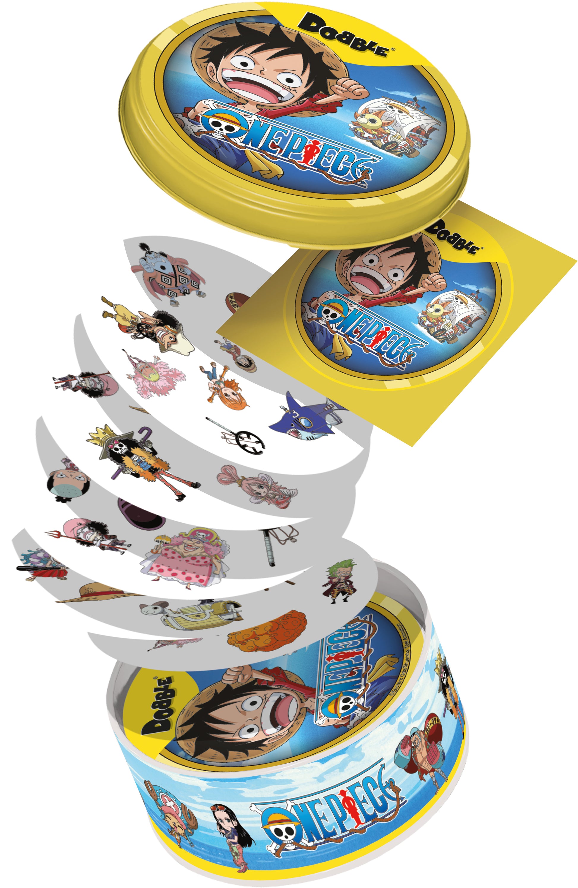 Dobble One Piece es un juego de mesa rápido, simple y tremendamente entretenido, ideal para fanáticos del anime y para quienes buscan diversión inmediata. Con ilustraciones inspiradas en el mundo de One Piece, cada carta está llena de símbolos de personajes, objetos y elementos icónicos de la serie… y siempre hay solo uno que se repite entre cualquier par de cartas. Tu misión es detectarlo antes que los demás y gritarlo sin dudar, como si estuvieras compitiendo por ser el Rey de los Piratas.